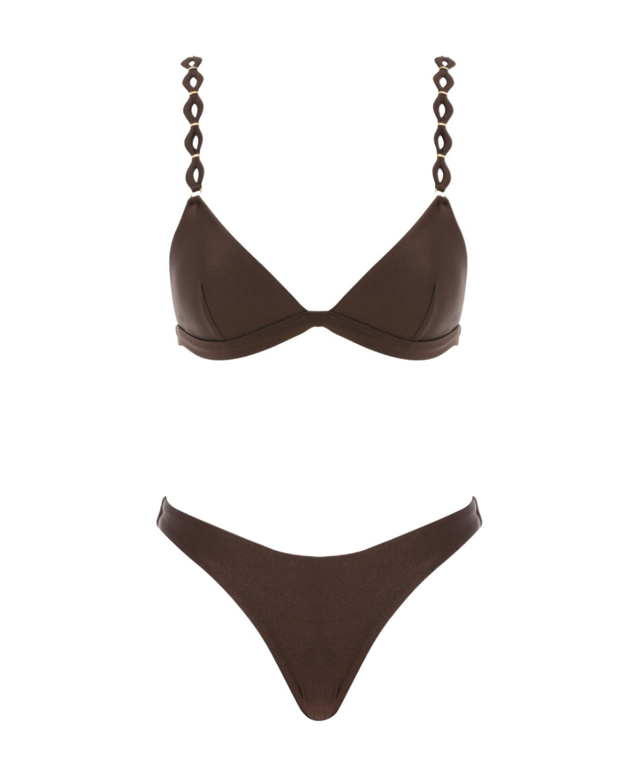 Chocolate color, diamond-trimmed bra, molded bra cups, clip in the center of the rear of the bra, buckle fixation with logo engraved buckle, adjustable shoulder straps, hollowed-out and gold metal eyelets, briefs.