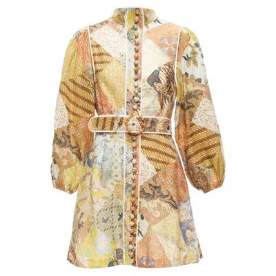 ZIMMERMANN Brightside Linen Patchwork Ethnic Print Belted Dress In Brown