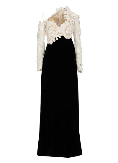 - Black Zimmermann silk blend dress for woman - Asymmetric neckline - Long sleeves - Contrasting fabric and color upper part - Lace embroidery at upper part with floral pattern - Rear zip and hook fastening - Flared hem Composition: 80% Viscose, 20% Silk Fabric 2:, 100% Polyester Fabric 3:, 100% Silk Fabric 4:, 100% Viscose Fabric 5:, 100% Polyester Trims:, 70% Cotton, 30% Polyamide