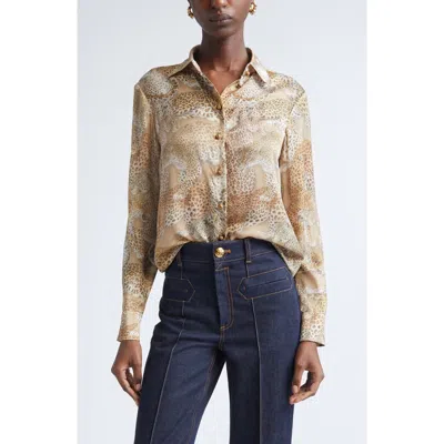Romantic, rebellious—and just the right amount of theatrical—this relaxed-fit silk shirt evokes the 'Twisted Romance' collection's escapism aesthetic, featuring a leap-of-leopards print that creates a savanna-inspired camo. Front button closure Spread collar Long sleeves with two-button cuffs Side slits 100% silk Dry clean Imported Designer Clothing