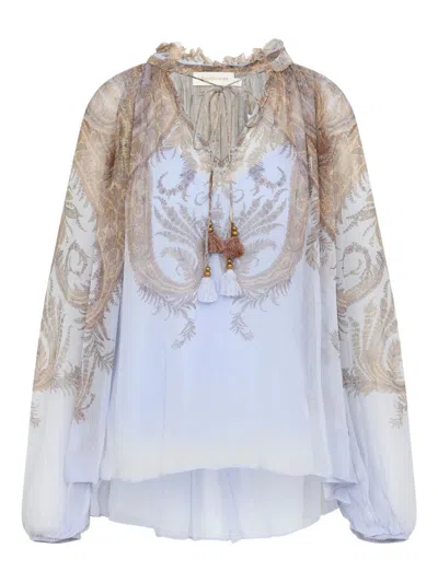 light purple paisley print ruffled neckline long sleeves drawstring neckline tassel detail