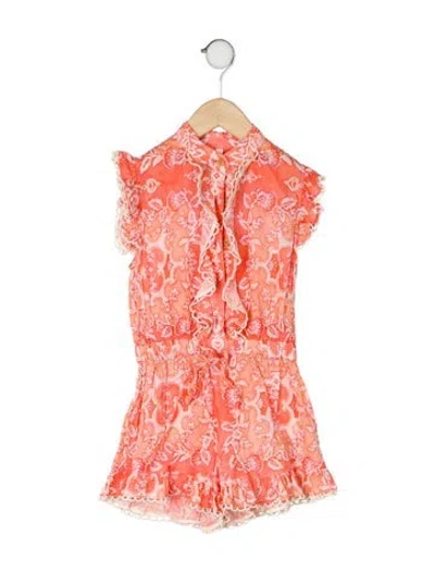 Girls' white and orange cotton Zimmermann short sleeve romper with floral print and cut out accent. Machine washable. | Zimmermann Short Sleeve Romper in Orange/White