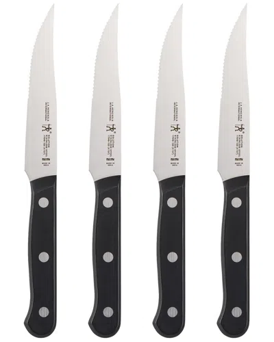 About The Brand: Cutting-Edge Kitchenware Steeped In Tradition And Made In Germany. Color/Finish: Stainless Steel Design Details: Every Time Meat Is On The Menu, You'll Want To Reach For The Henckels International Solution 4-Pc Steak Knife Set. Fabricated From High-Quality Stainless Steel, The Single-Piece, Precision-Stamped Blades Boast Excellent Cutting Precision. Effortlessly Slice Steaks, Pork Chops, And Chicken Cutlets Every Time. The Professional, Satin-Polished, Fine-Edge Blades Are Finely Honed For Long-Lasting Precision. The Knives' Full Tang Construction And Ergonomic Handles Give You The Balance And Strength You Need To Confidently Slice Through Tough Cuts With Ease. Easy To Use, These Dishwasher-Safe Knives Are Also Easy To Maintain. Henckels International Makes Essential Kitchen Knives That Every Home Chef Needs. Each Knife Offers High Quality At An Exceptional Value. Created In 1895 By Zwilling J. A. Henckels, This Value-Driven Brand Guarantees The Same Durability, Design And Ease Of Use For Which The Global Company Is Known. Equip Your Kitchen With Expertise With Henckels International. Fabricated From High Quality Stainless Steel. Single-Piece, Precision-Stamped Blade Construction Provides Durability. Professional, Satin-Finished Blade Boasts Precision Cutting And Is Finely Honed For Long-Lasting Sharpness. Lightweight Full Tang Design Yields Maximum Maneuverability. Traditional Triple-Rivet Handle Offers Balance And Is Curved For Comfort. Dishwasher Safe. Made In India. Measures 10.75In X 1In X 6In Materials: Stainless Steel Food Safe Dishwasher Safe Imported